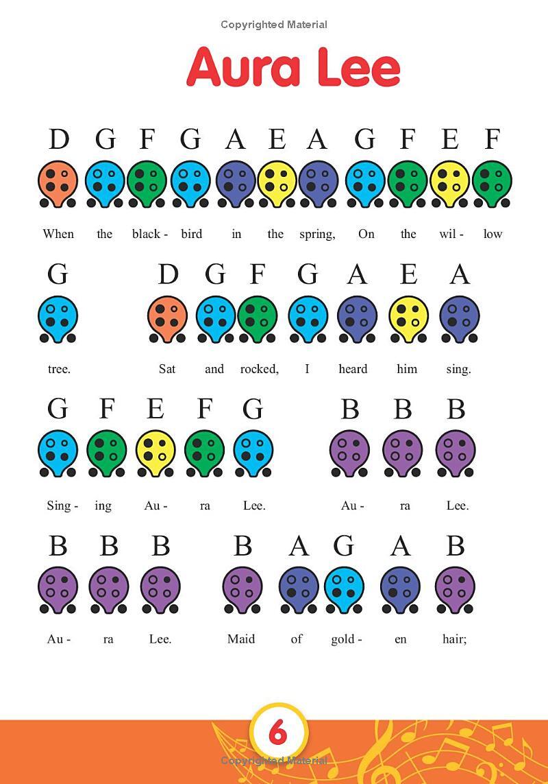 My sheet music includes fingering positions, letter-coded notation, and song lyrics for a 6-hole ocarina.