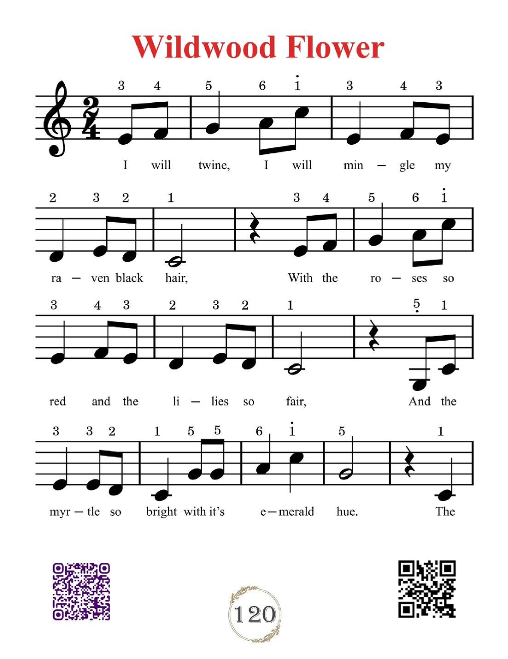 Each song page includes two QR codes that provide additional resources: