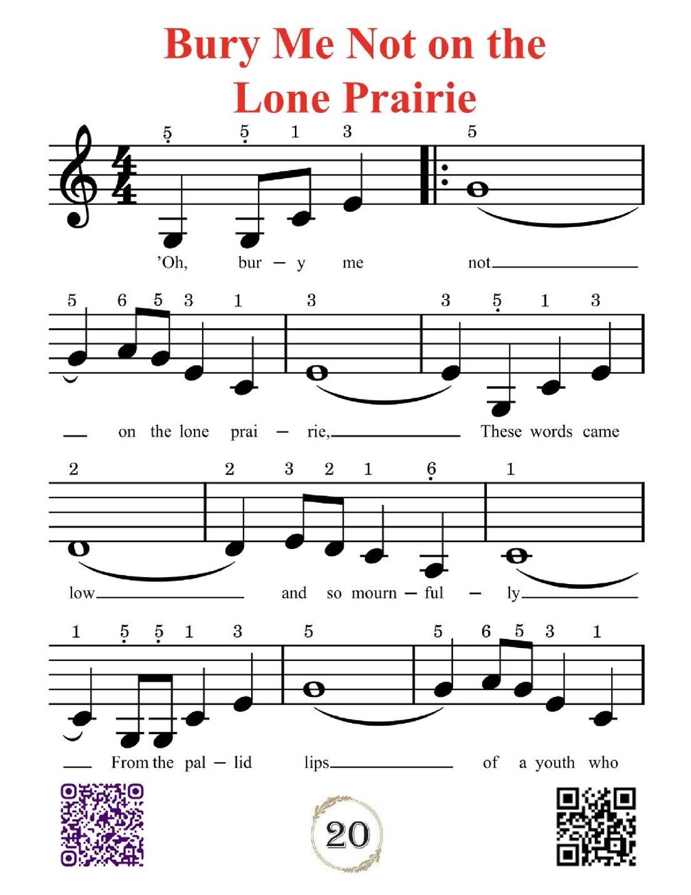 Each song page includes two QR codes that provide additional resources: