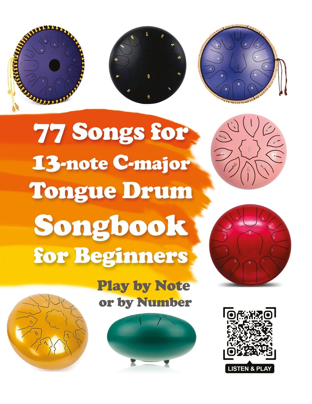 The book features 77 songs, all of which can be played on any C-major tongue drum with 13 or more keys. Most of the songs can also be played on an 11-key tongue drum.
